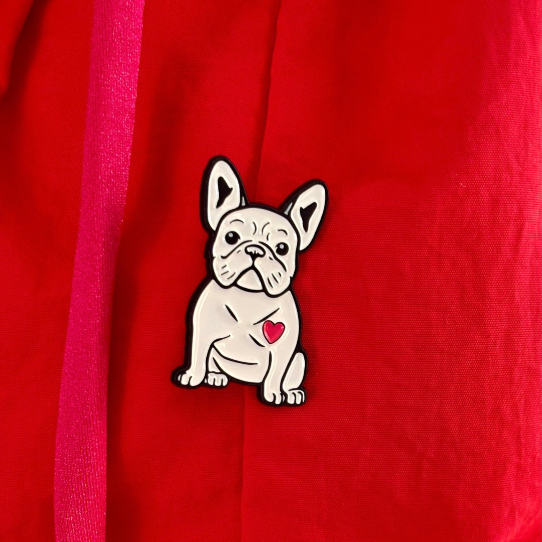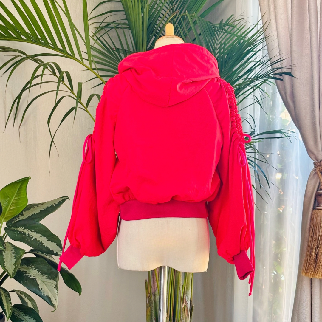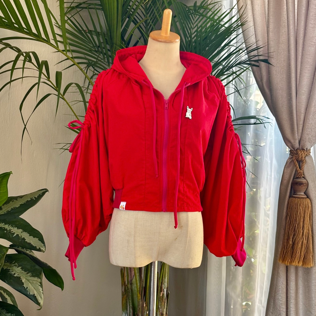 Our play on a cropped bomber jacket x windbraker. This stunning jacket features a very dramatic flared drawstring sleeve, ribbed cuffs and waistband with a chunky zip and drawstring hood. The Valentine’s edition includes the sweetest Frenchie brooch (remove when washing the jacket)